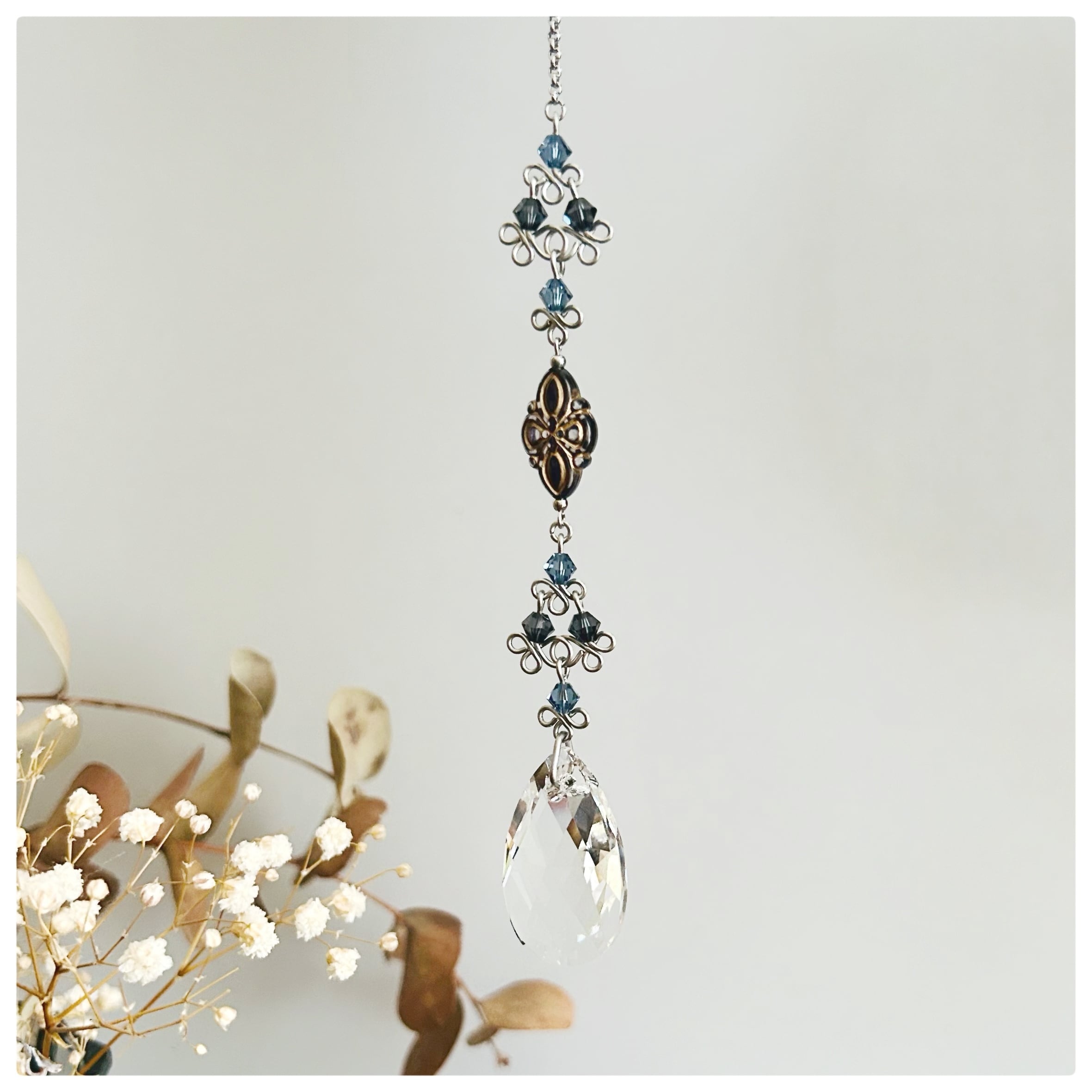 深いブルーでまとめたダイアナのサンキャッチャー。オリエンタルな雰囲気のアクリルパーツをポイントに一粒。28ミリのクリスタルガラスだけでなく全体がキラキラ光るサンキャッチャーです。