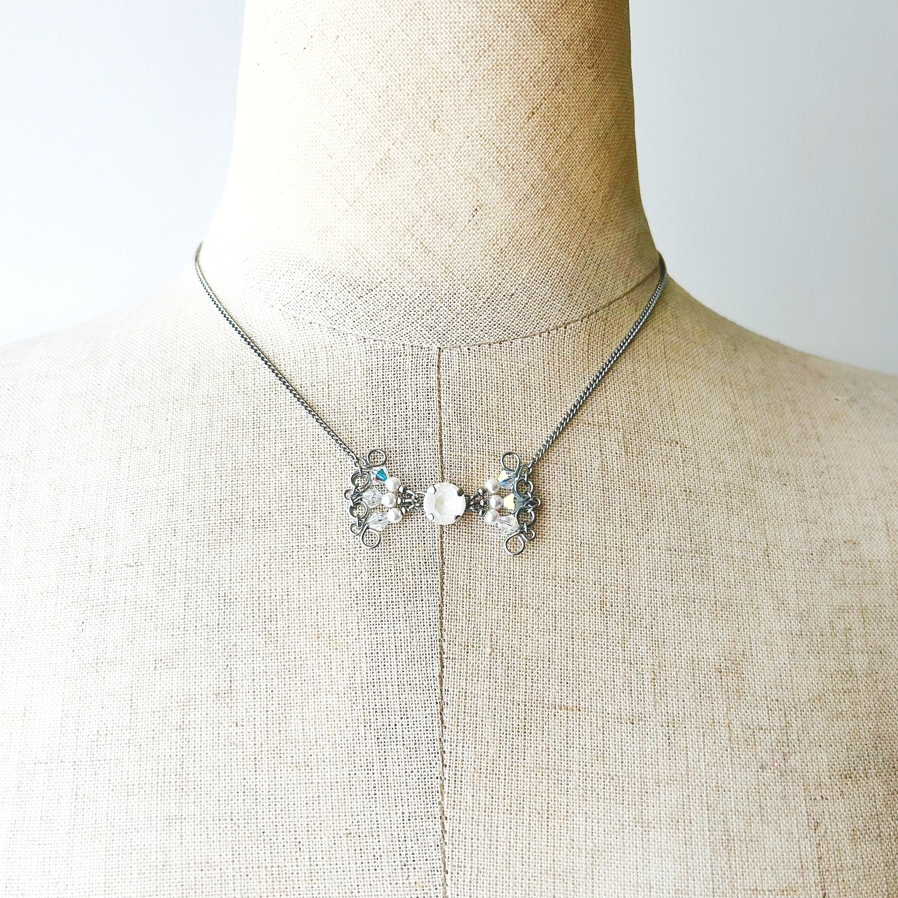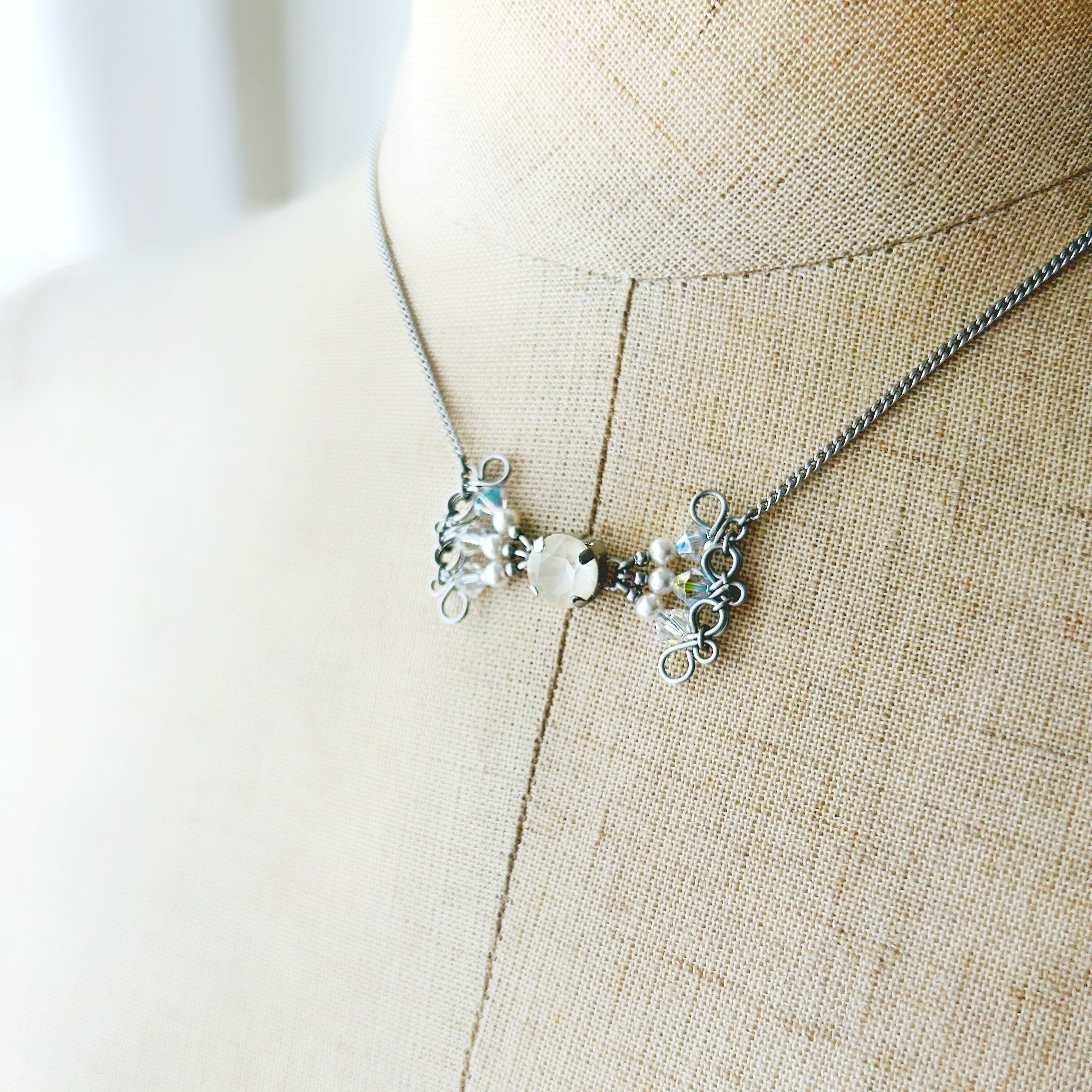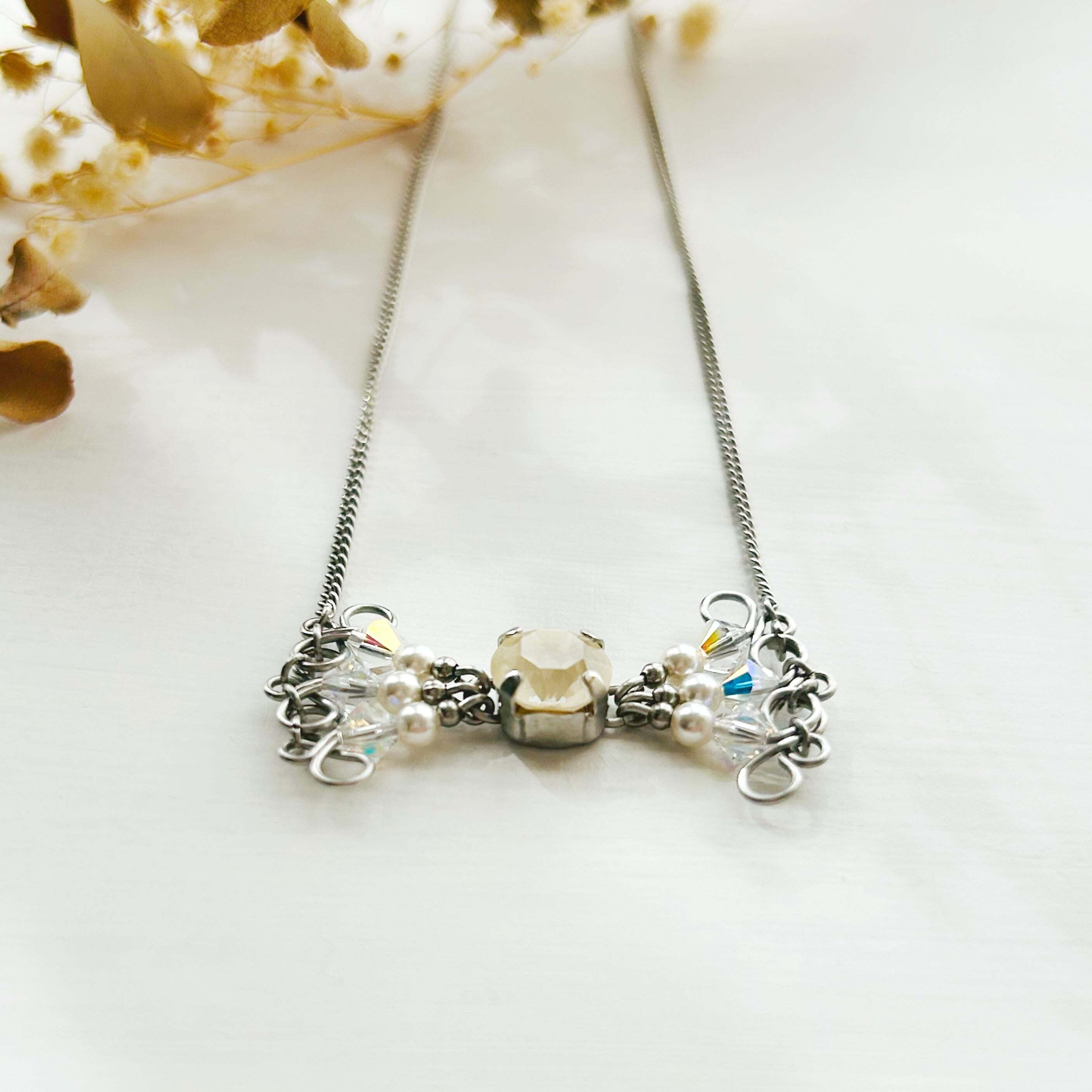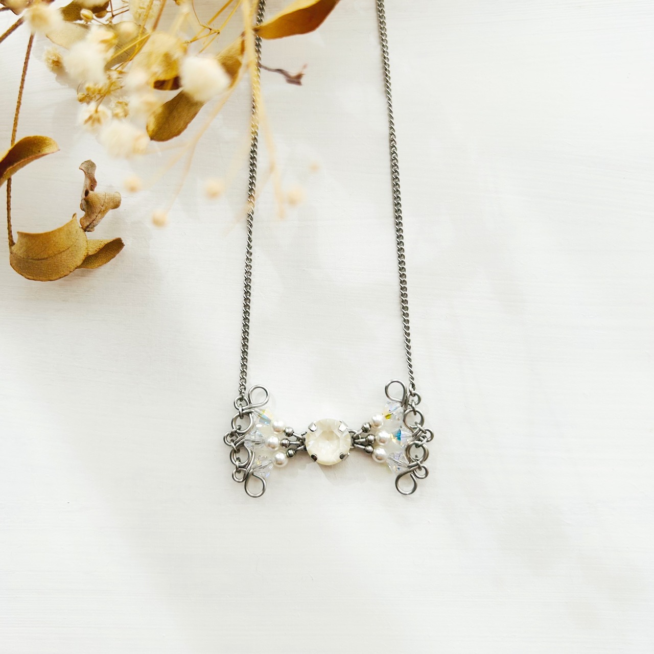 クリスタルガラスビーズで組み上げた、リボンモチーフのネックレス。インパクトがありながらも主張しすぎない程良いサイズ感です。蝶ネクタイのようにも見えて可愛い♪