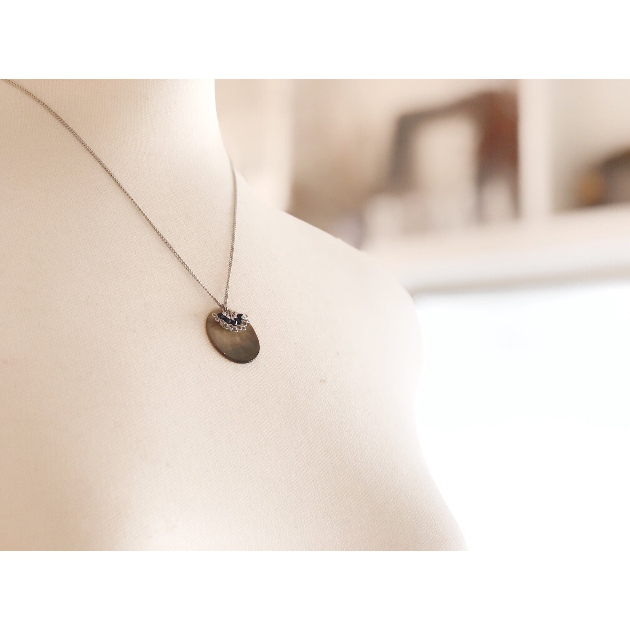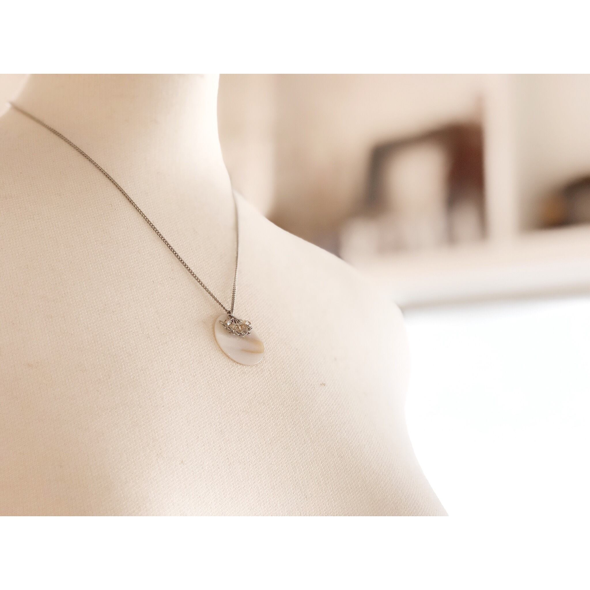 丸くカットされたシェルプレートに扇型のワイヤーレースが重なり揺れるペンダント。ブラックはシックな雰囲気&ホワイトは優しい雰囲気。光の当たり具合によって天然素材ならではの美しい輝きの変化が見られます。