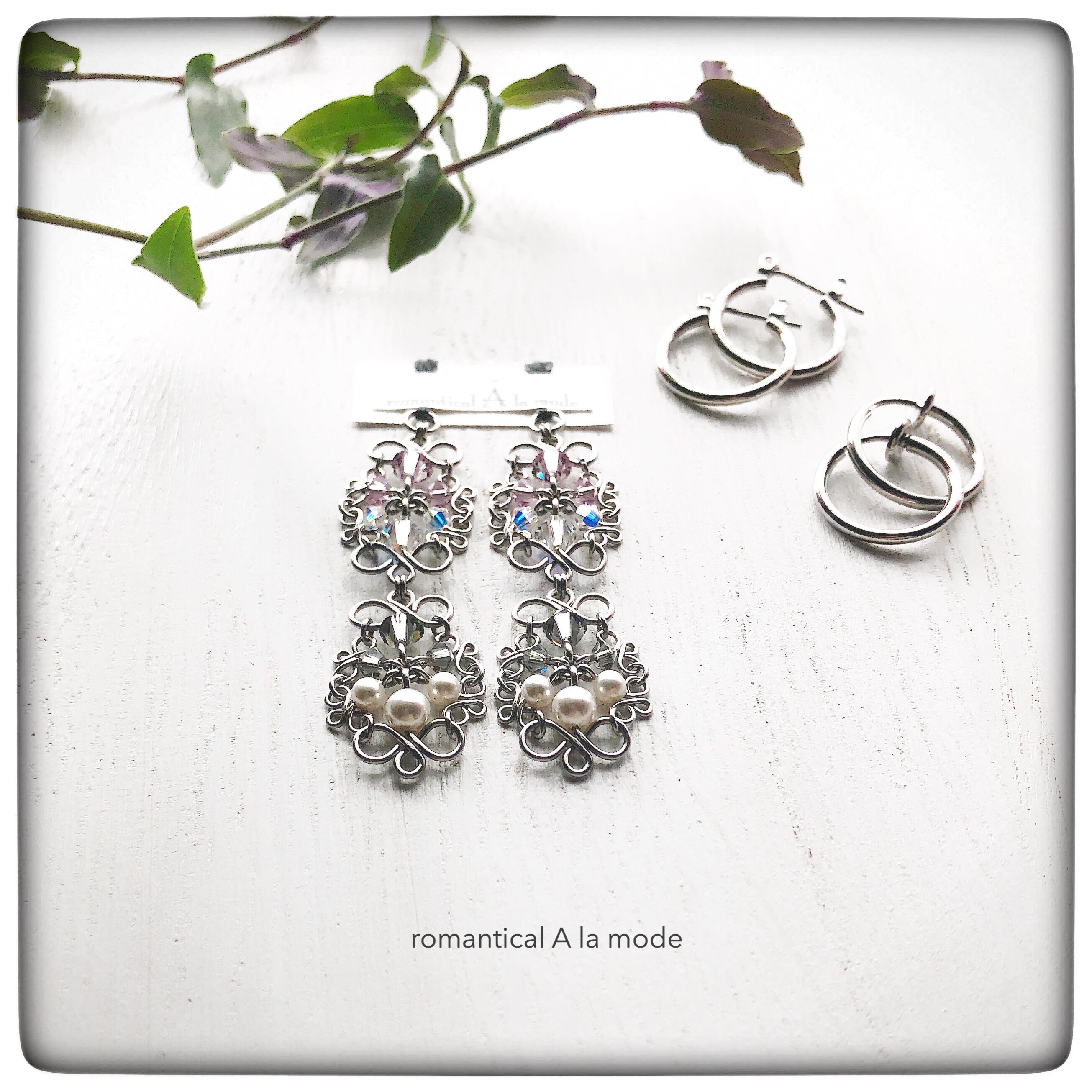 繊細なワイヤーレースのモチーフを二段に連ねたイヤーチャーム。軽く優しく揺れるデザインで女性らしさ満点です♪カッコいい系のコーディネートに合わせれば、より美しさが映えて女性らしいイメージに変身。優しいカラーのスワロフスキービーズとパールの上品効果は抜群です♪