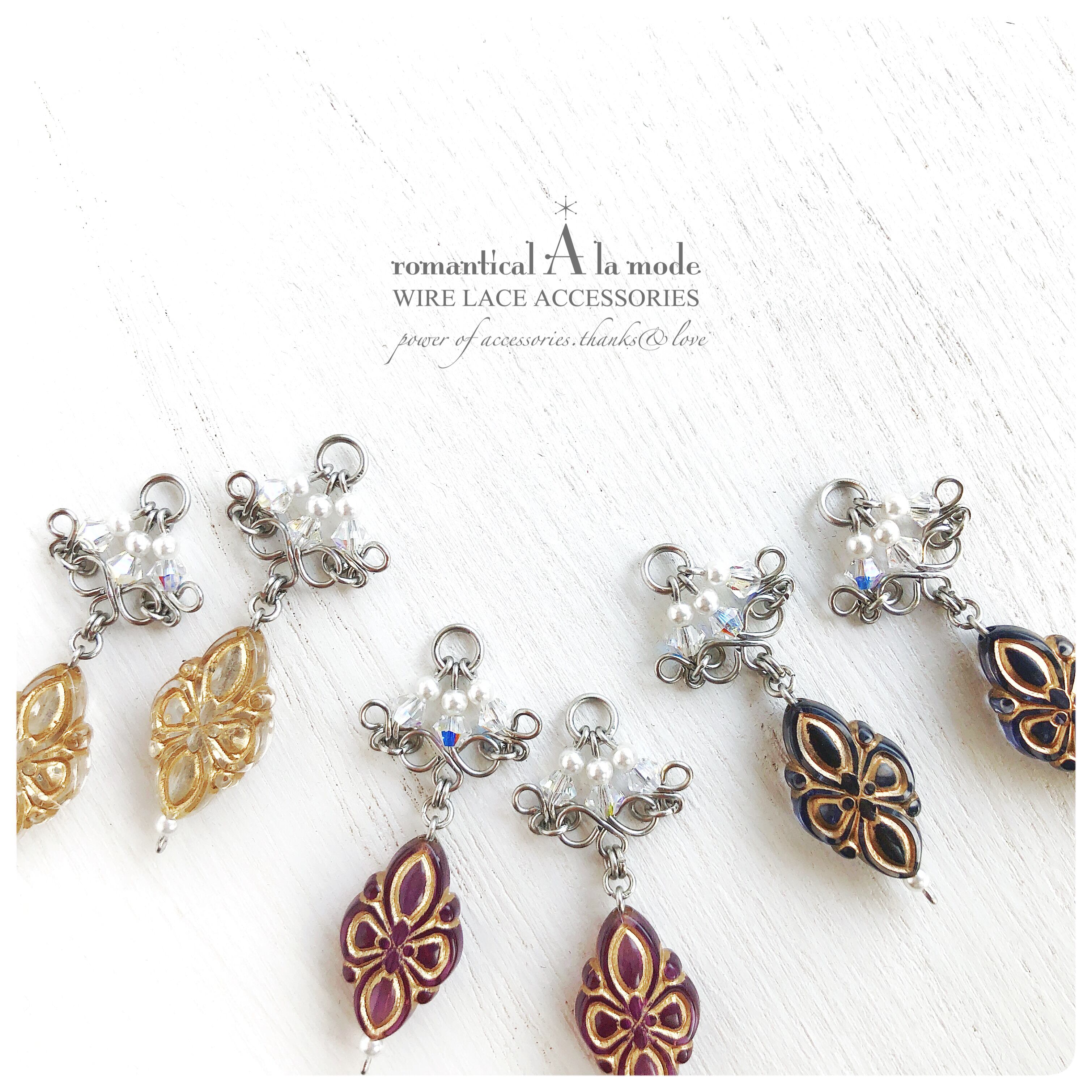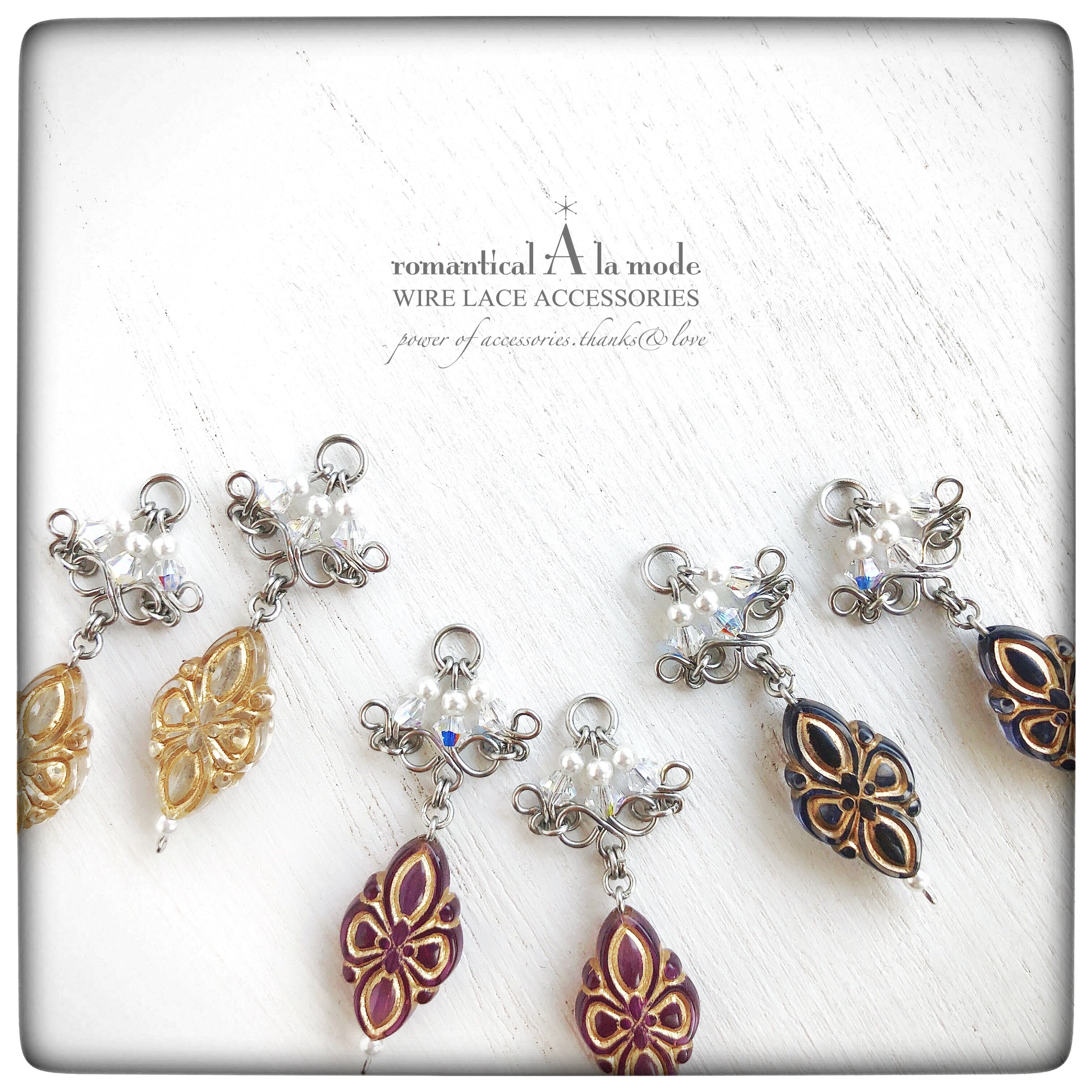 オリエンタルな空気感漂うアクリルパーツを使用したイヤーチャーム。ワイヤーレースの部分のスワロフスキービーズがオーロラカラーにキラキラと輝きます☆