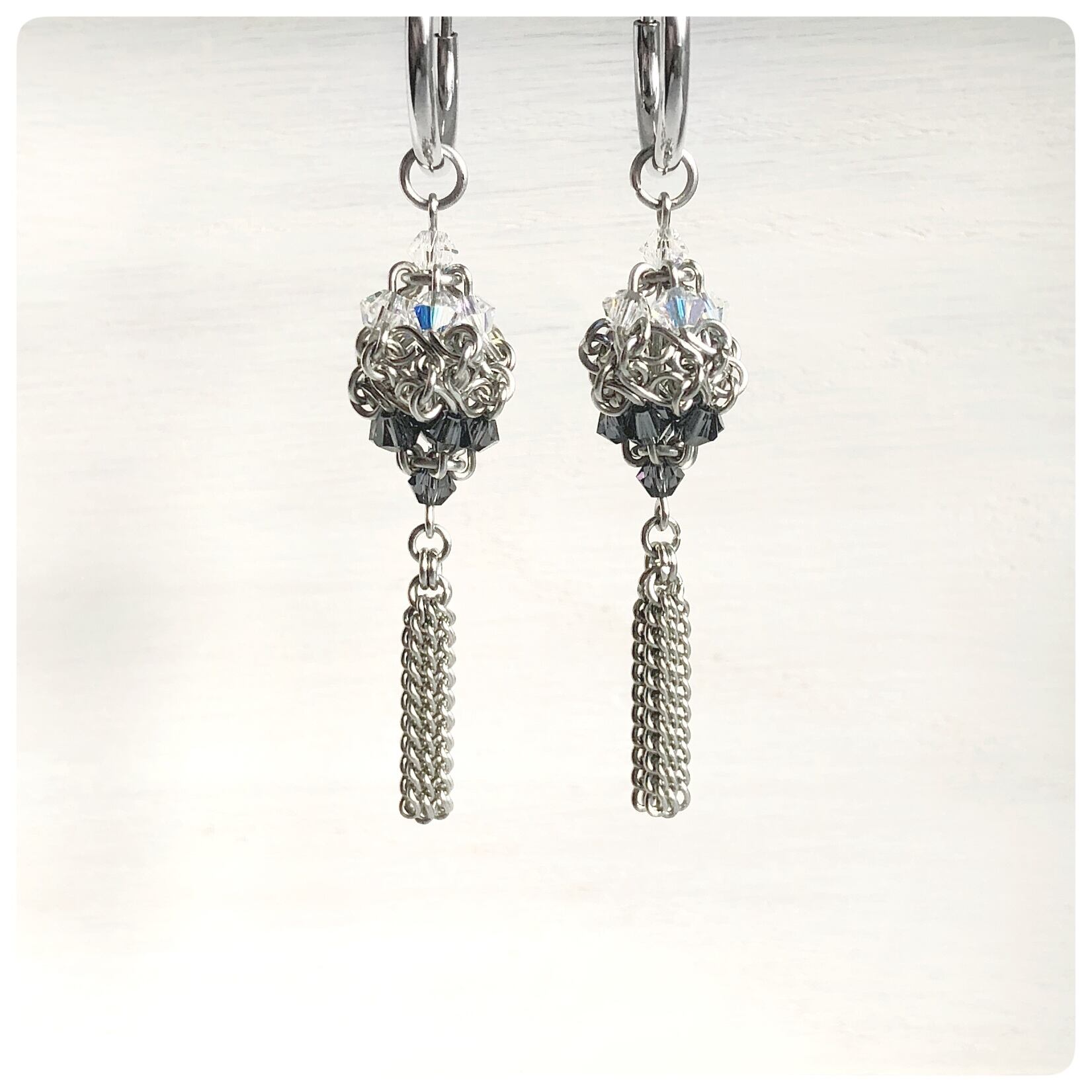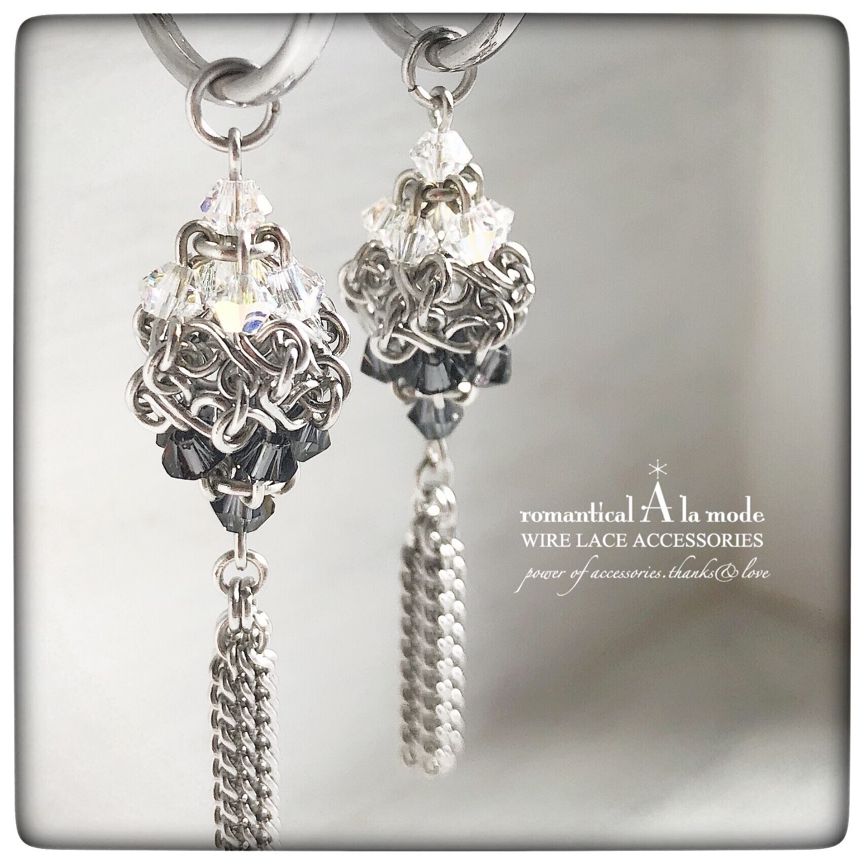 コロンと可愛いフォルムのワイヤーレースボールがシンプルな大人カラーでイヤーチャームになりました♪チェーンのタッセルをポイントに、360度どの角度からも美しく輝くデザイン。顔周りがキラキラ輝くと、気分もウキウキ華やかに☆