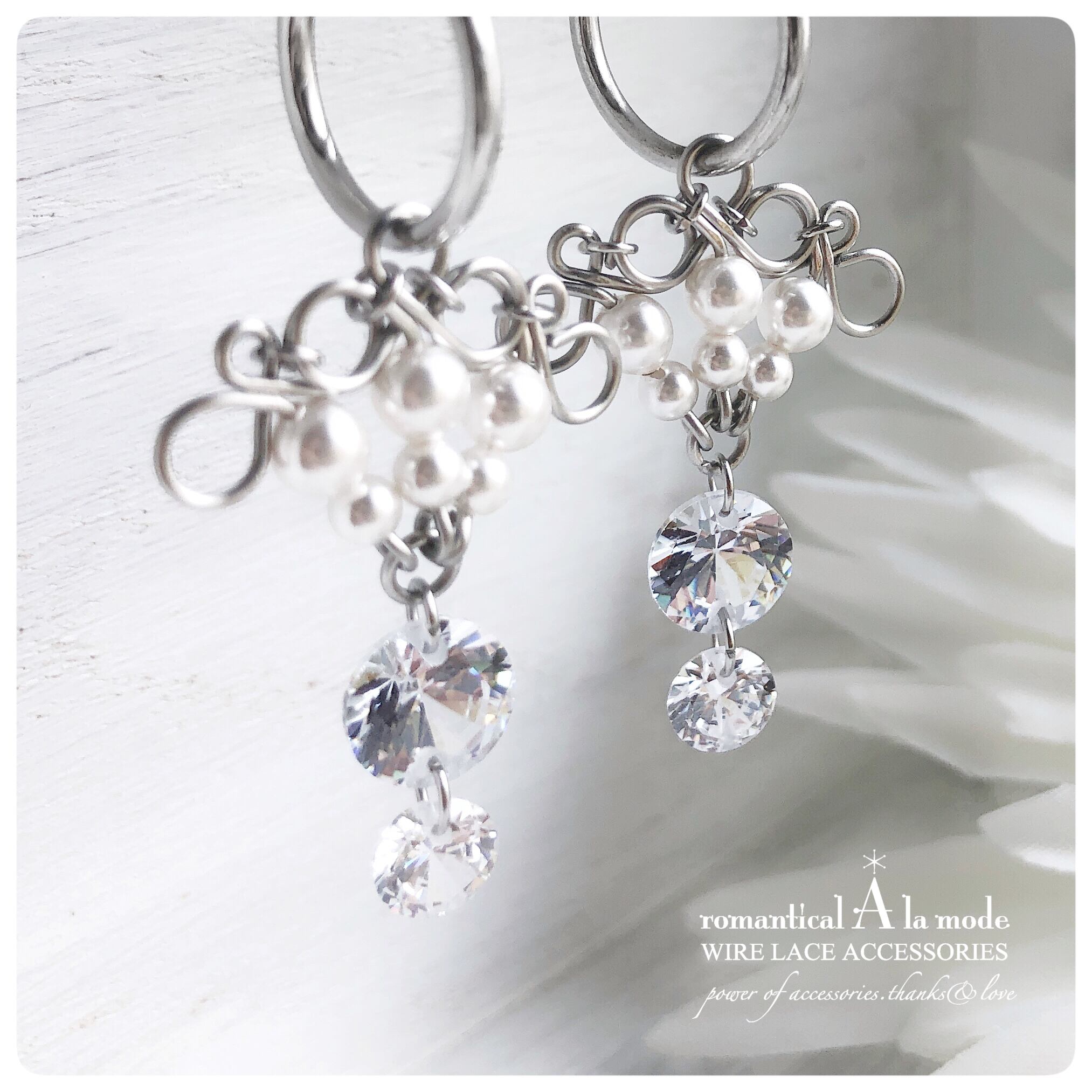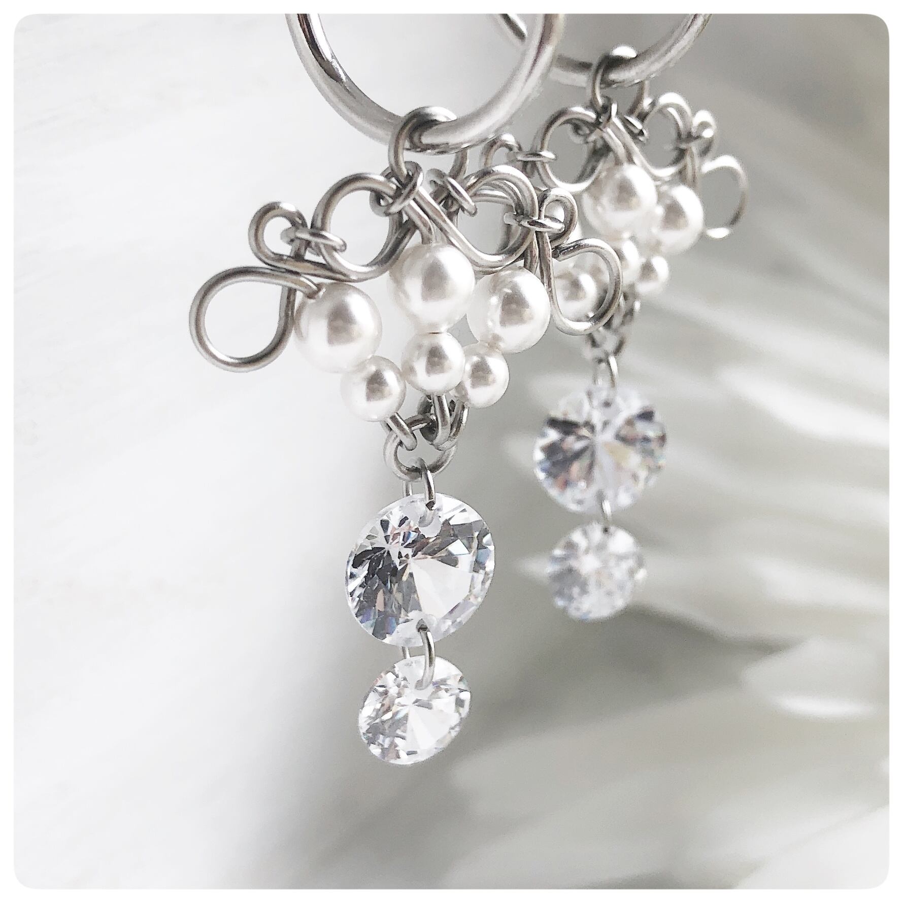 ダイヤモンドのような輝きを放つキュービックジルコニアを左右で4粒使用したキラキラのイヤーチャーム。上品なパールのモチーフの下でラグジュアリーに揺れています☆