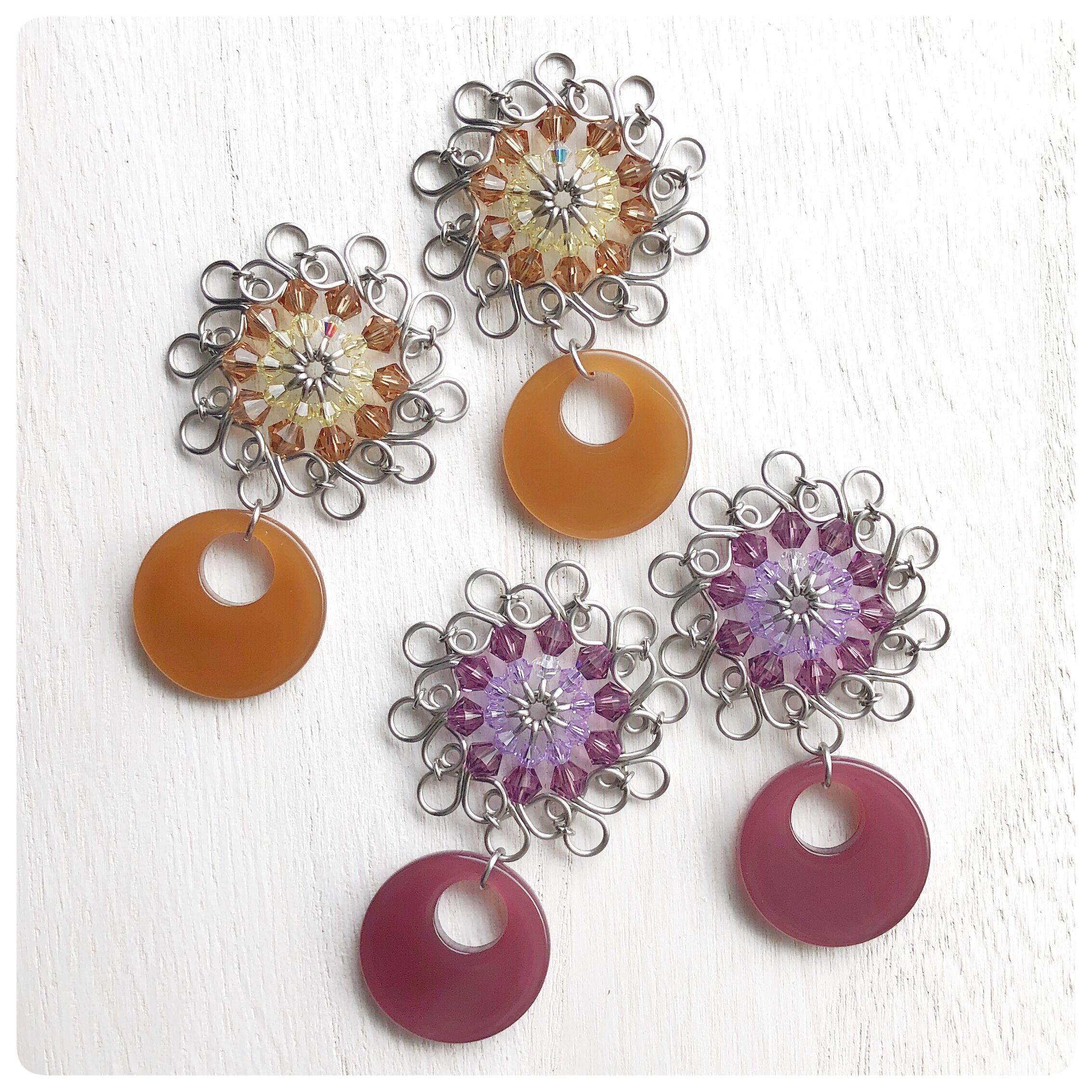 romaの定番モチーフDahlia(ダリア)に丸いアクリルプレートを付けたデザイン。耳元でヒラヒラと揺れてキラキラと輝きます☆ Dahliaモチーフの直径は3.2cm。大ぶりでも軽やかな印象のイヤーチャームです♪